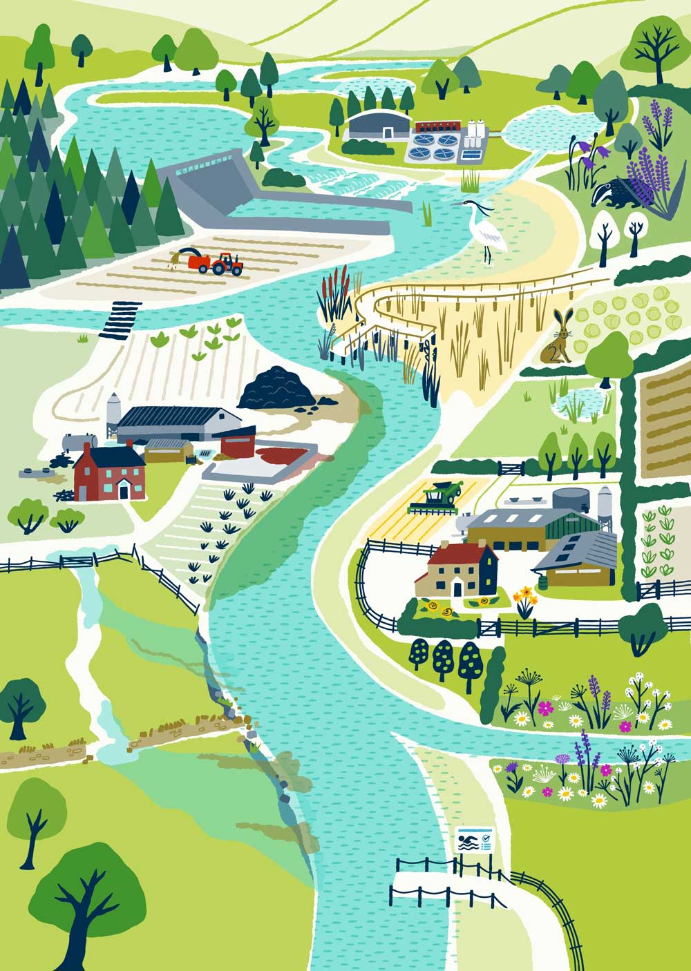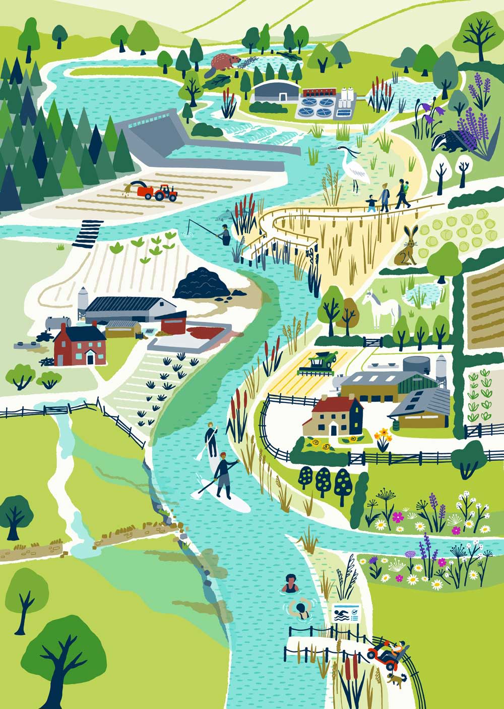 The right hand side of the river shows how things could be if we take a more holistic, catchment-wide approach, working in partnership.